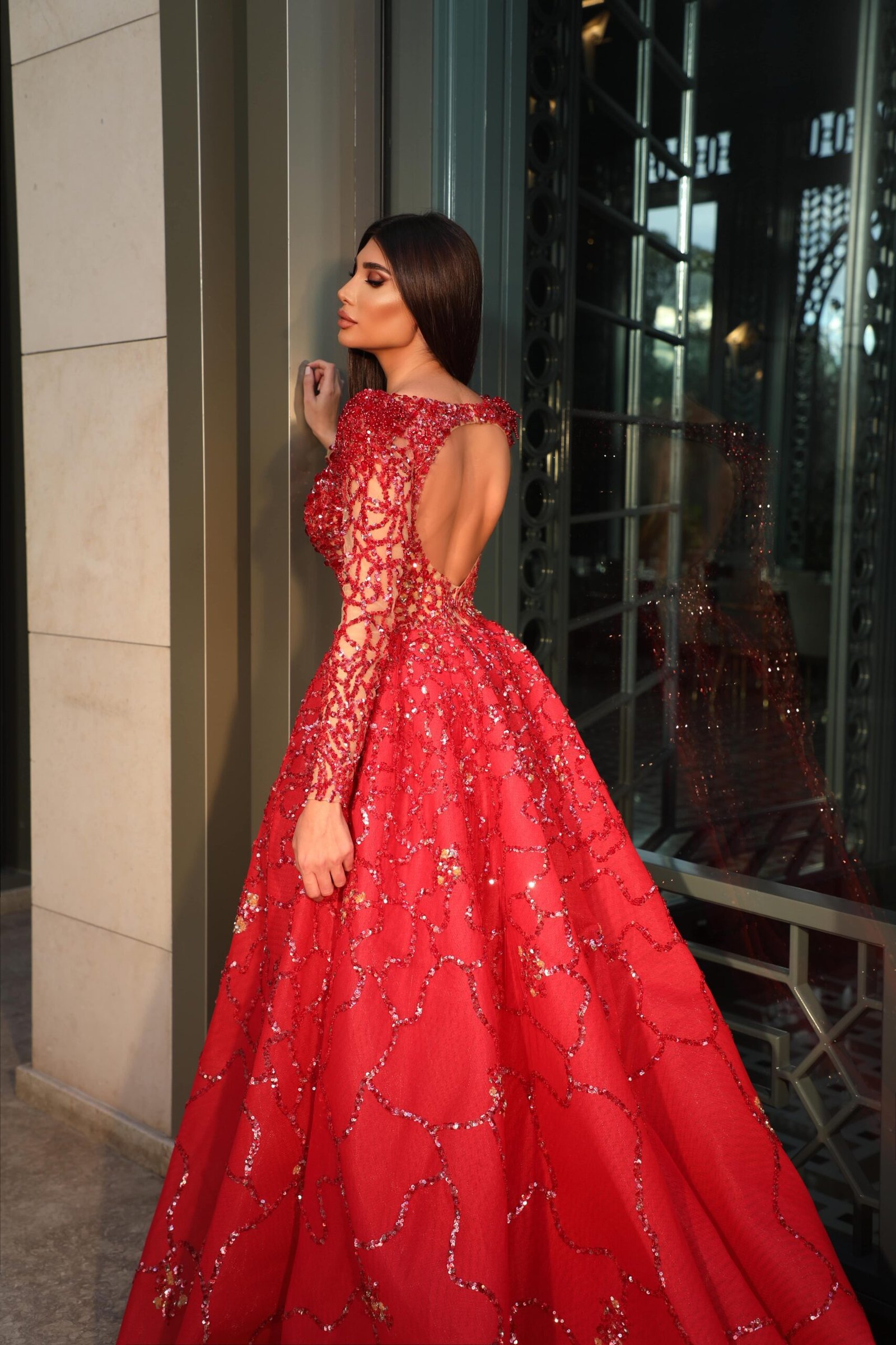 Bold, fiery, and irresistibly seductive Cherry Luxe turns every entrance into a moment of power. This stunning red gown features a body hugging bodice adorned with sparkling embellishments, flowing into voluminous skirt with daring high slit that teases with every step. Long illusion sleeves add elegance,