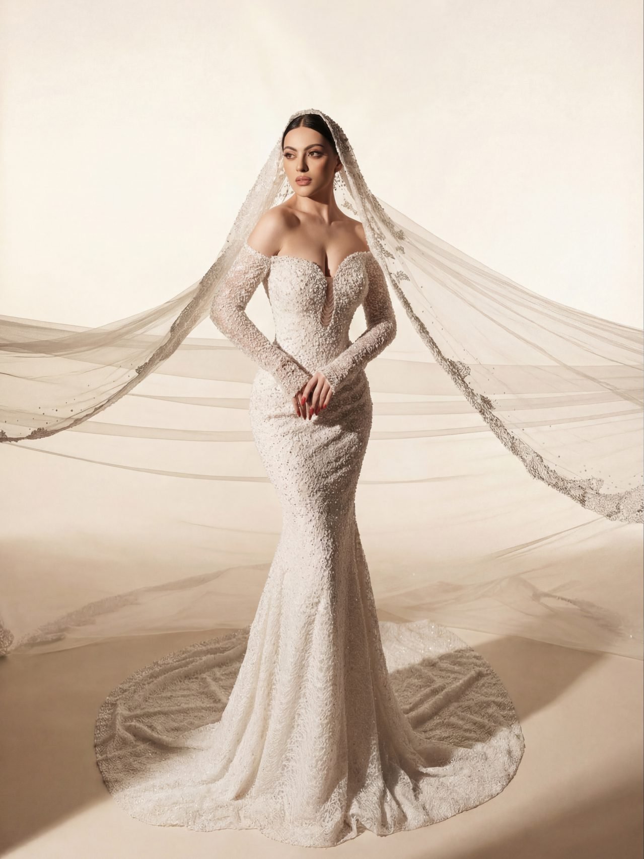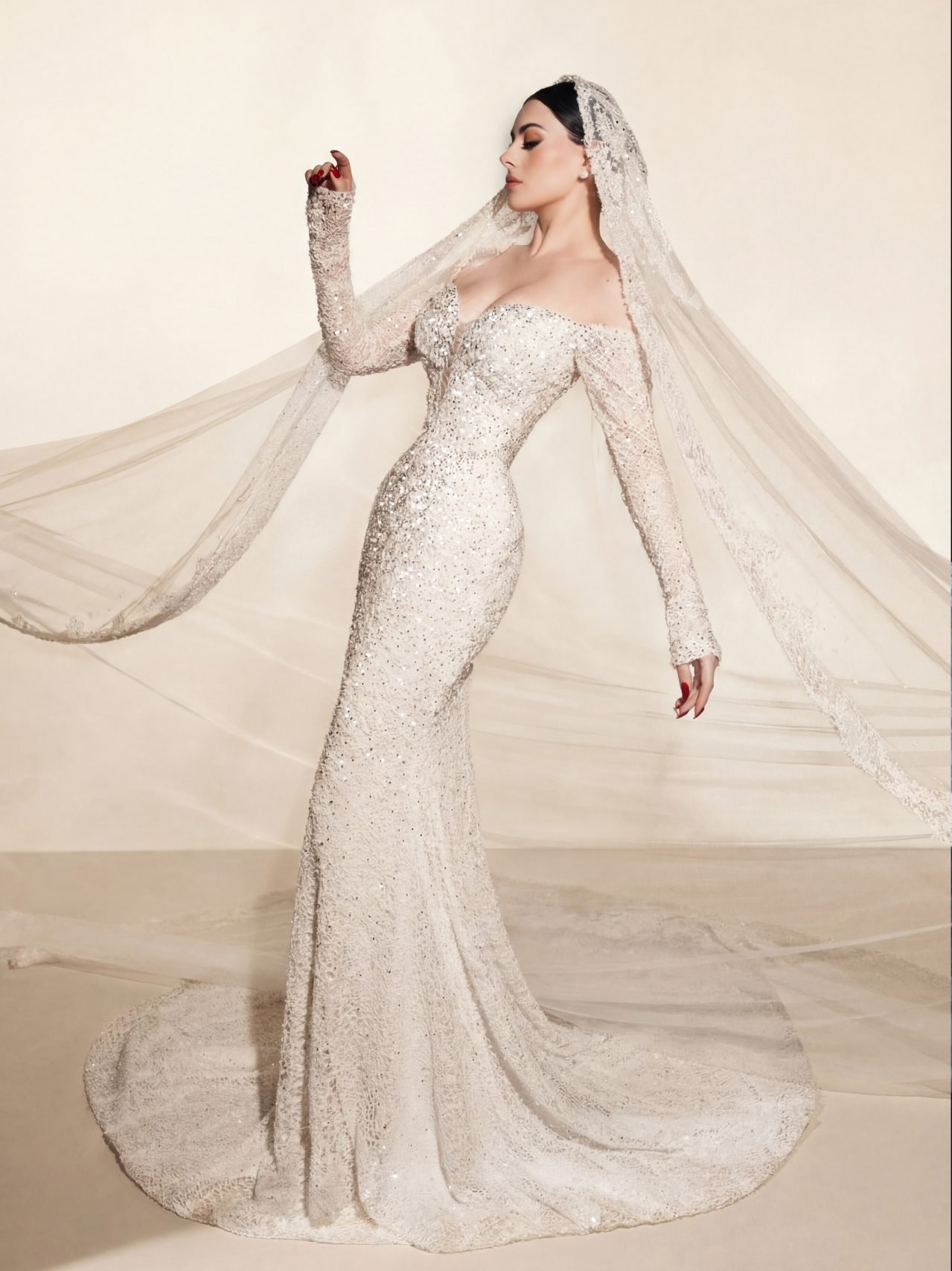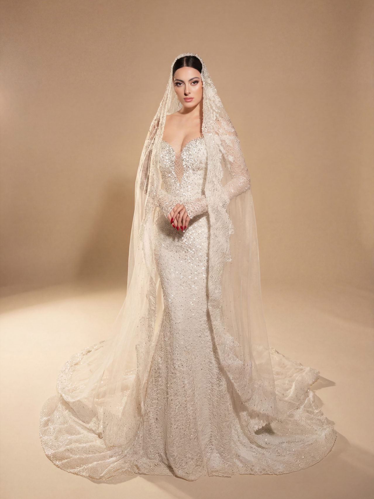 Graceful ode to eternal love and refined elegance. This sleek bridal gown features a beautifully contoured silhouette with a deep, softened neckline, delicately adorned with luminous pearl-like embellishments that shimmer with subtle sophistication.