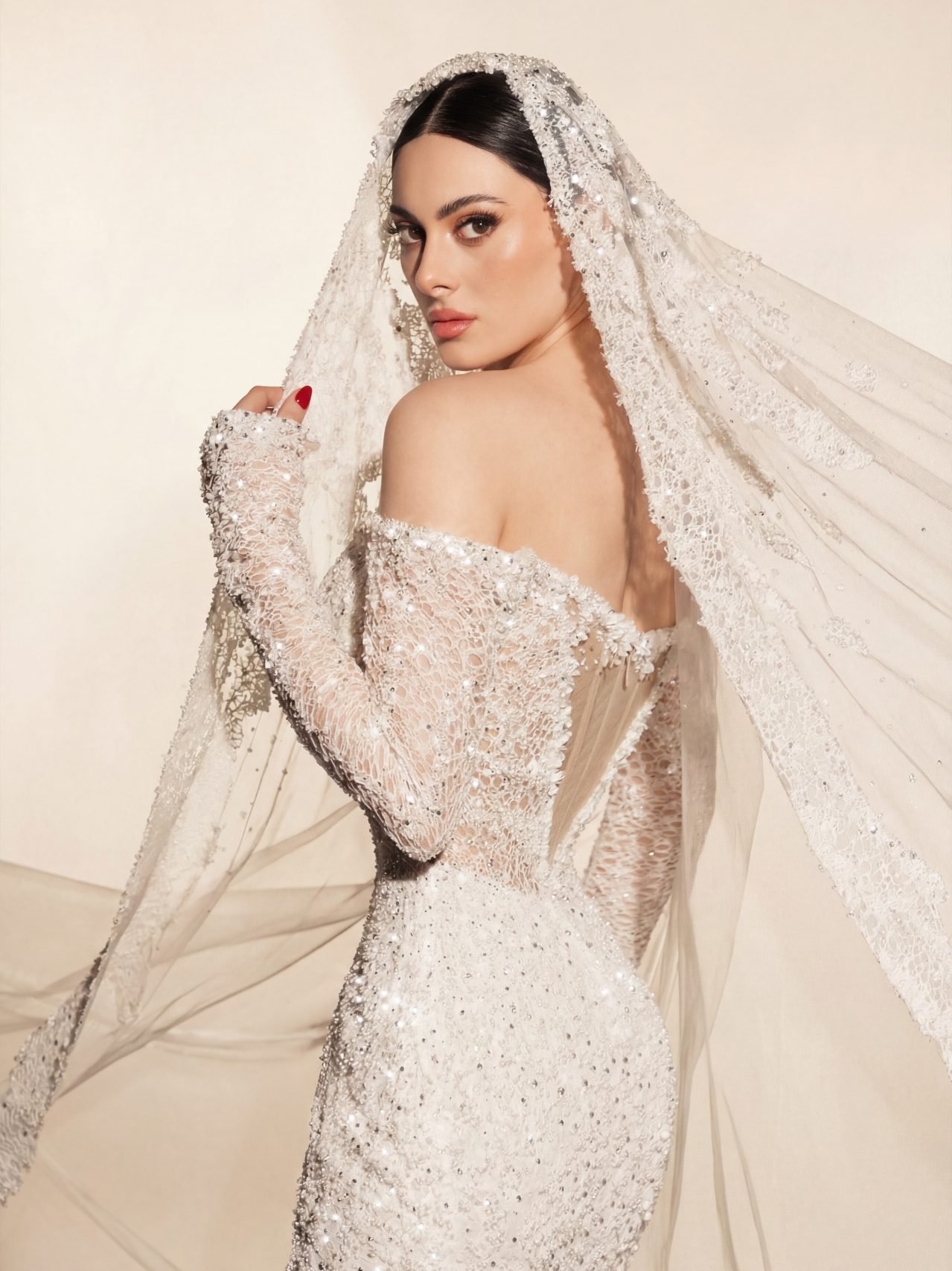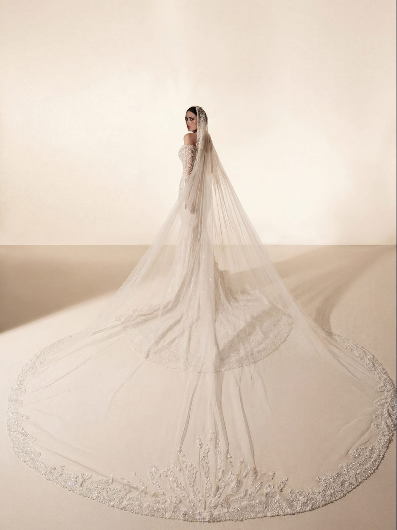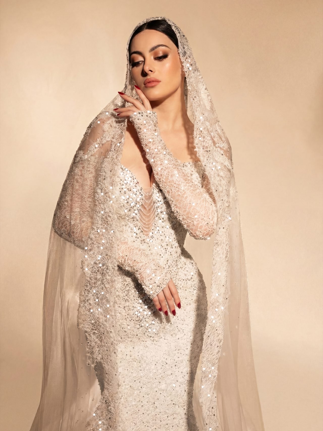 Graceful ode to eternal love and refined elegance. This sleek bridal gown features a beautifully contoured silhouette with a deep, softened neckline, delicately adorned with luminous pearl-like embellishments that shimmer with subtle sophistication.