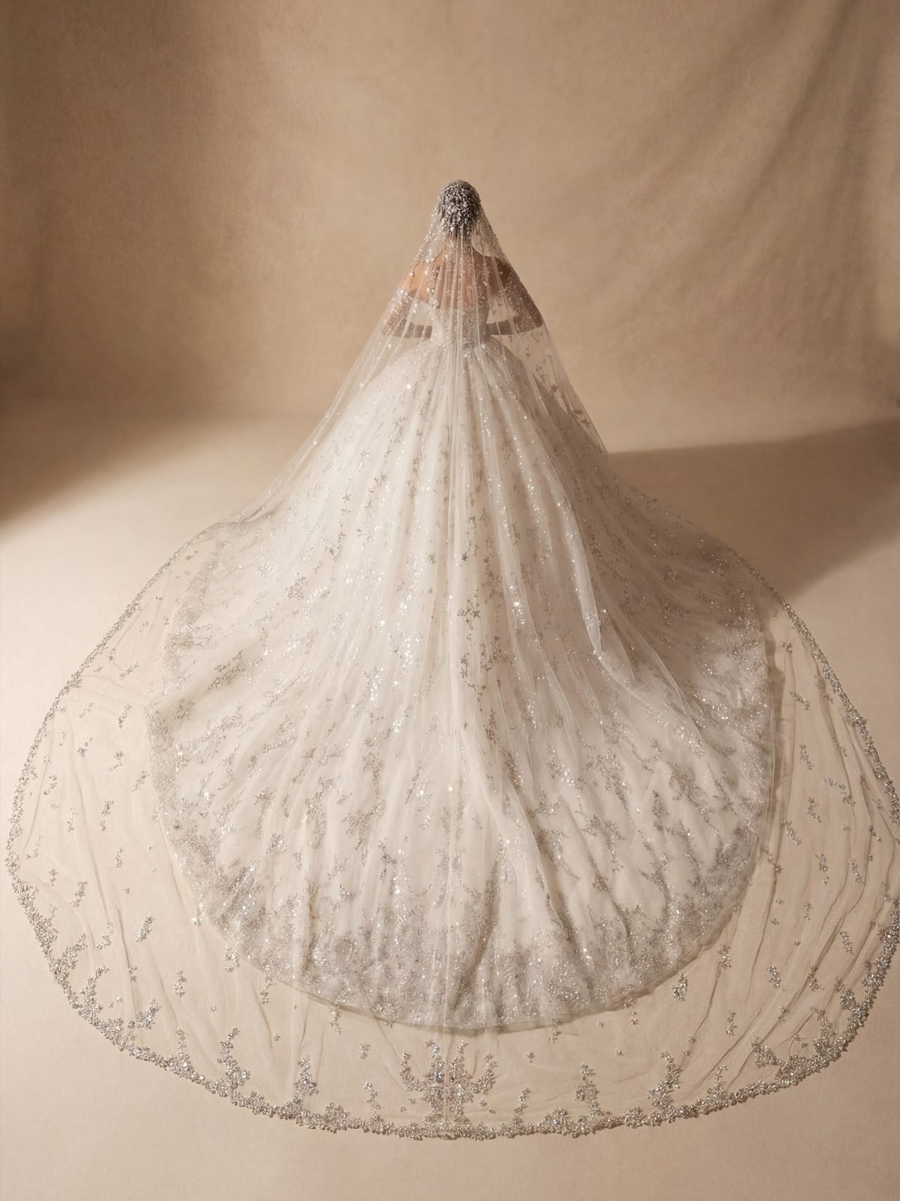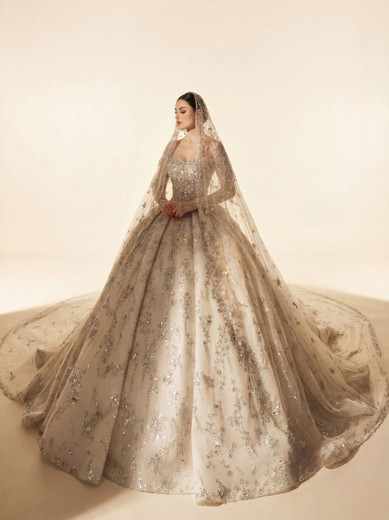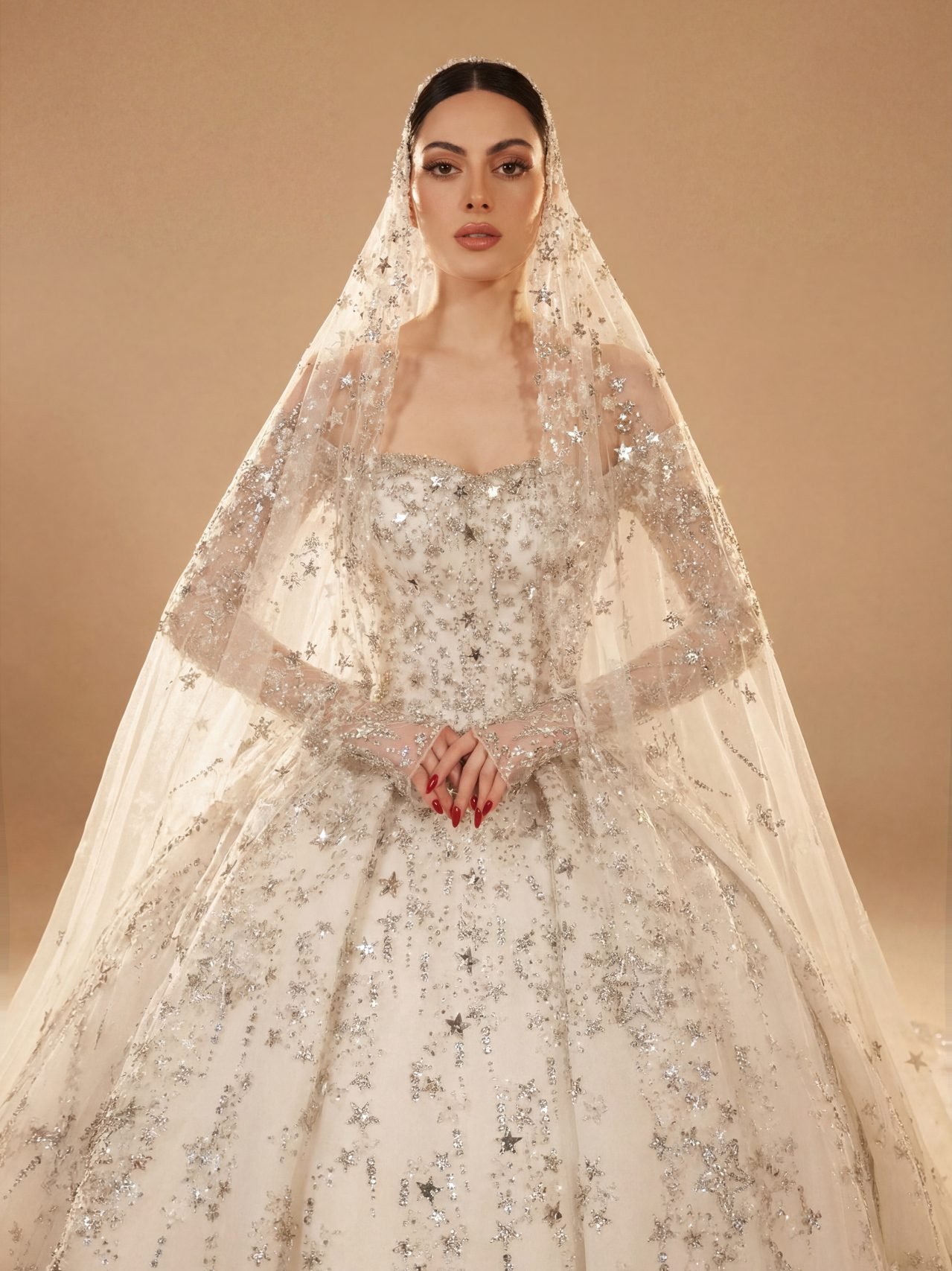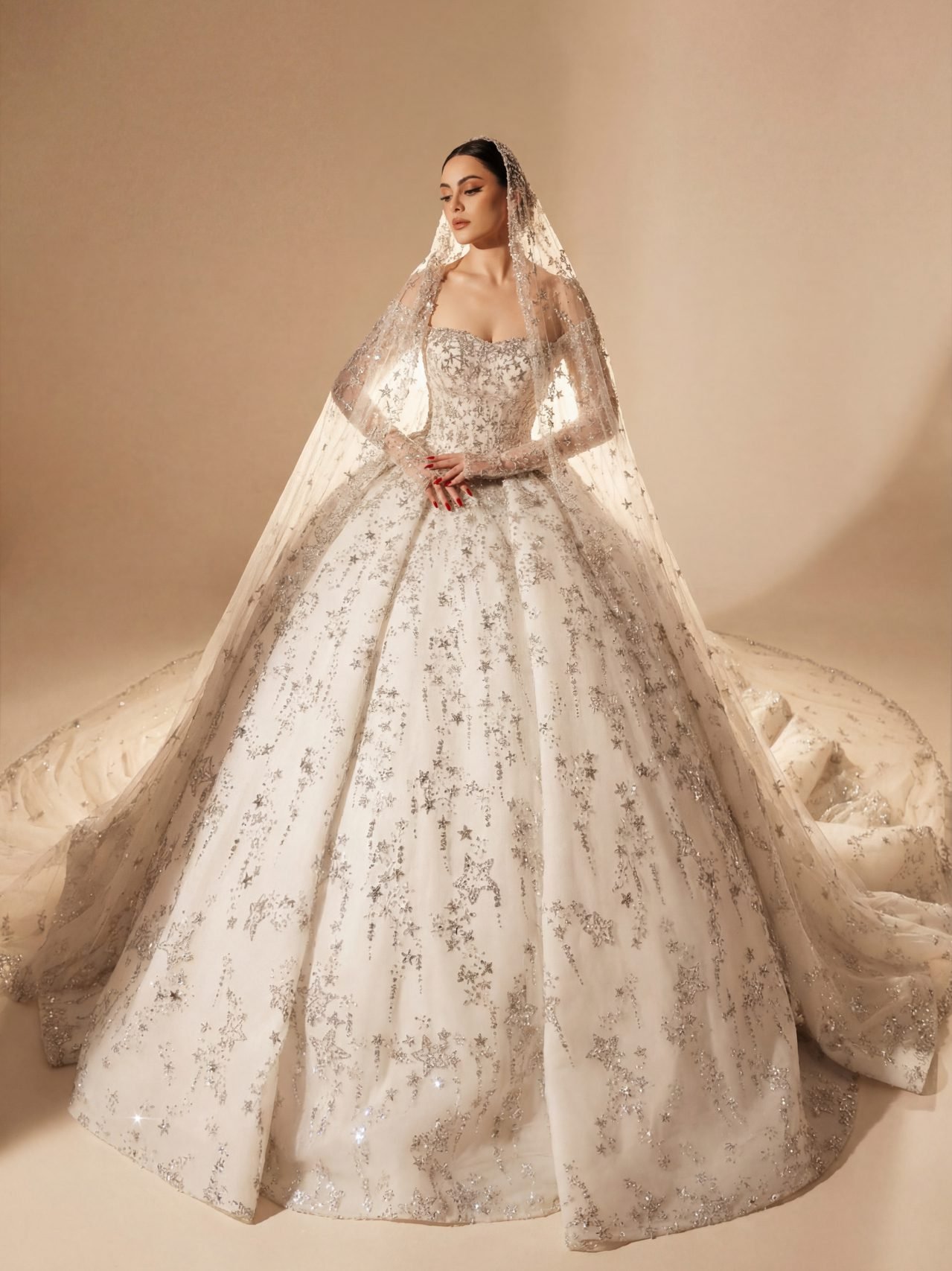 A radiant masterpiece inspired by the brilliance of a starlit night. This luxurious ball gown features a structured, fully embellished bodice decorated with shimmering crystals and delicate star-shaped embroidery that catch the light beautifully.