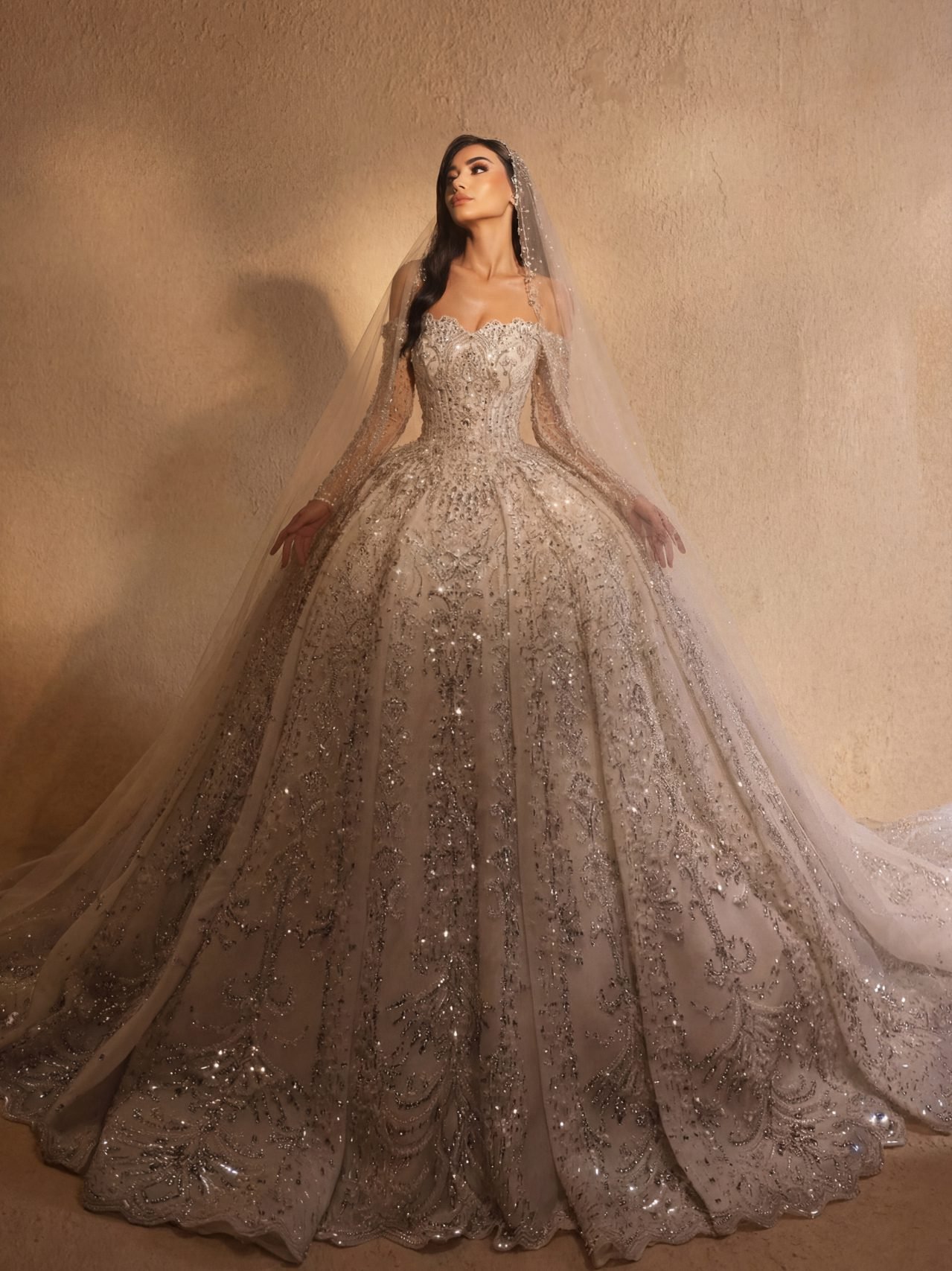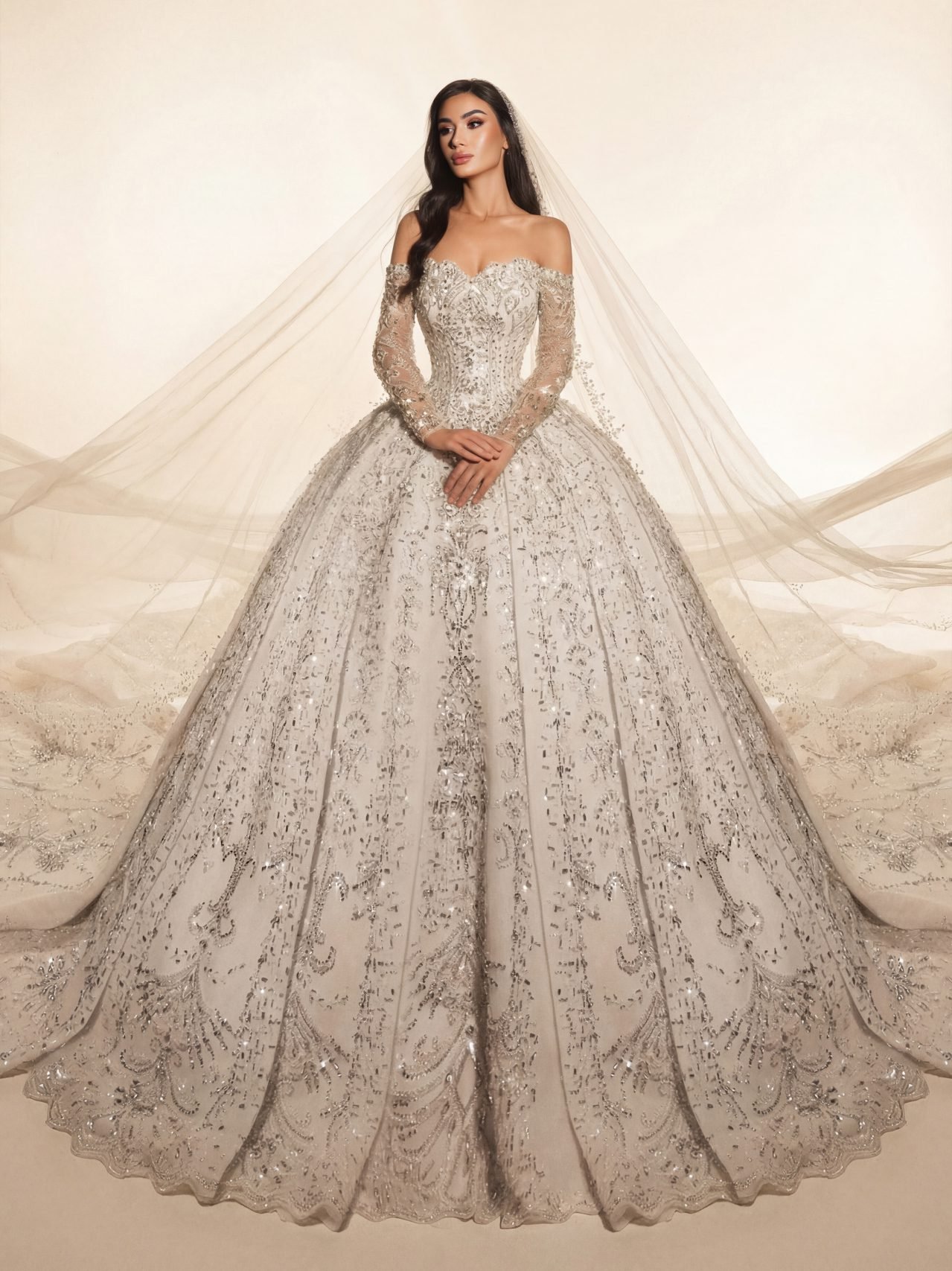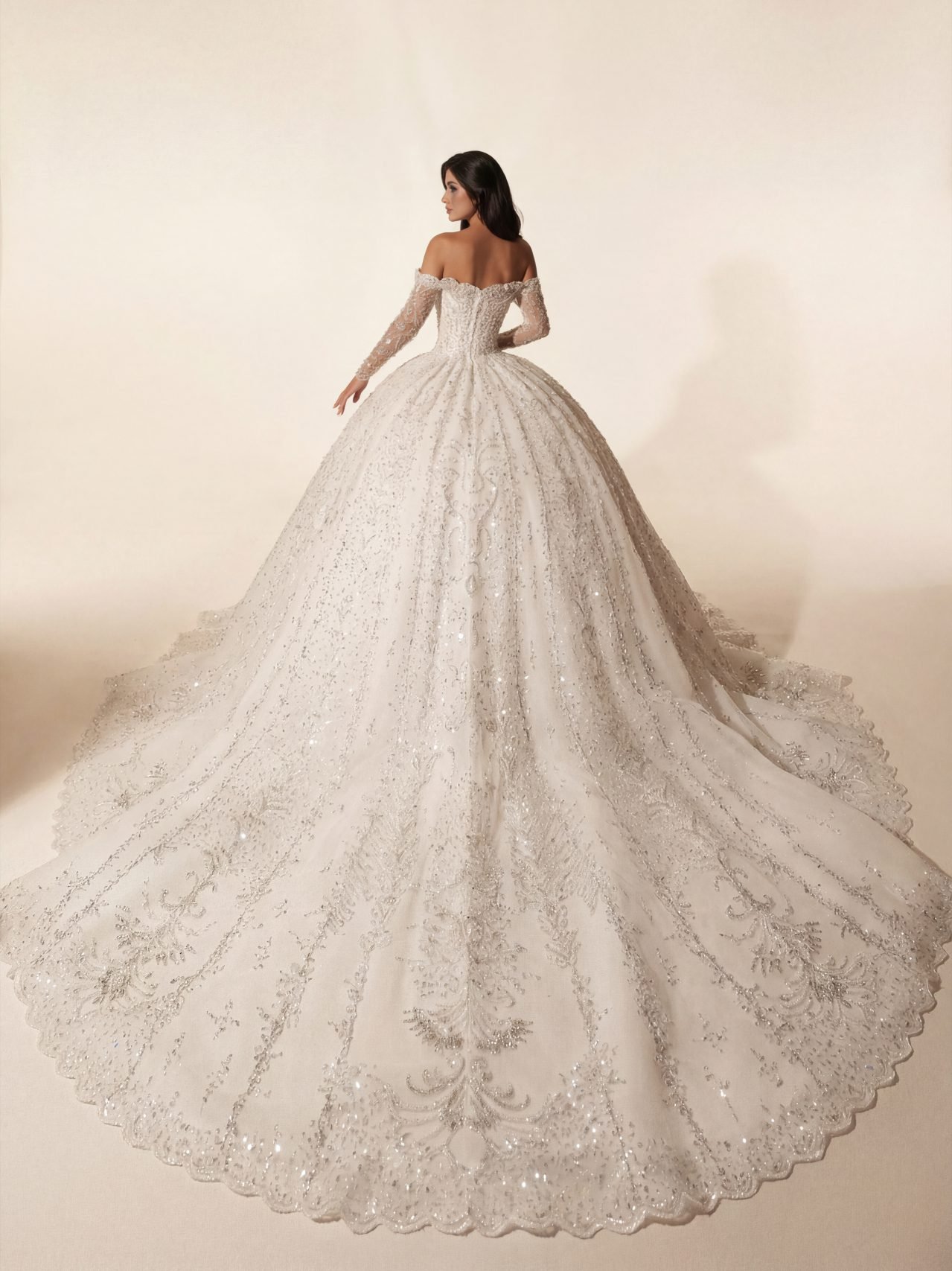 An off shoulder wedding gown with sweetheart neckline featuring a voluminous ball gown skirt, heavily encrusted with silver crystals and metallic beadworks in Baroque patterns that trail down to an elegant scalloped hemline