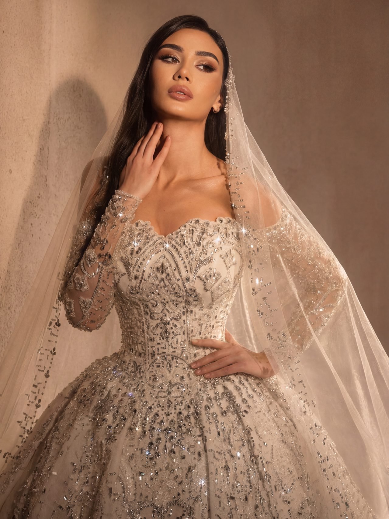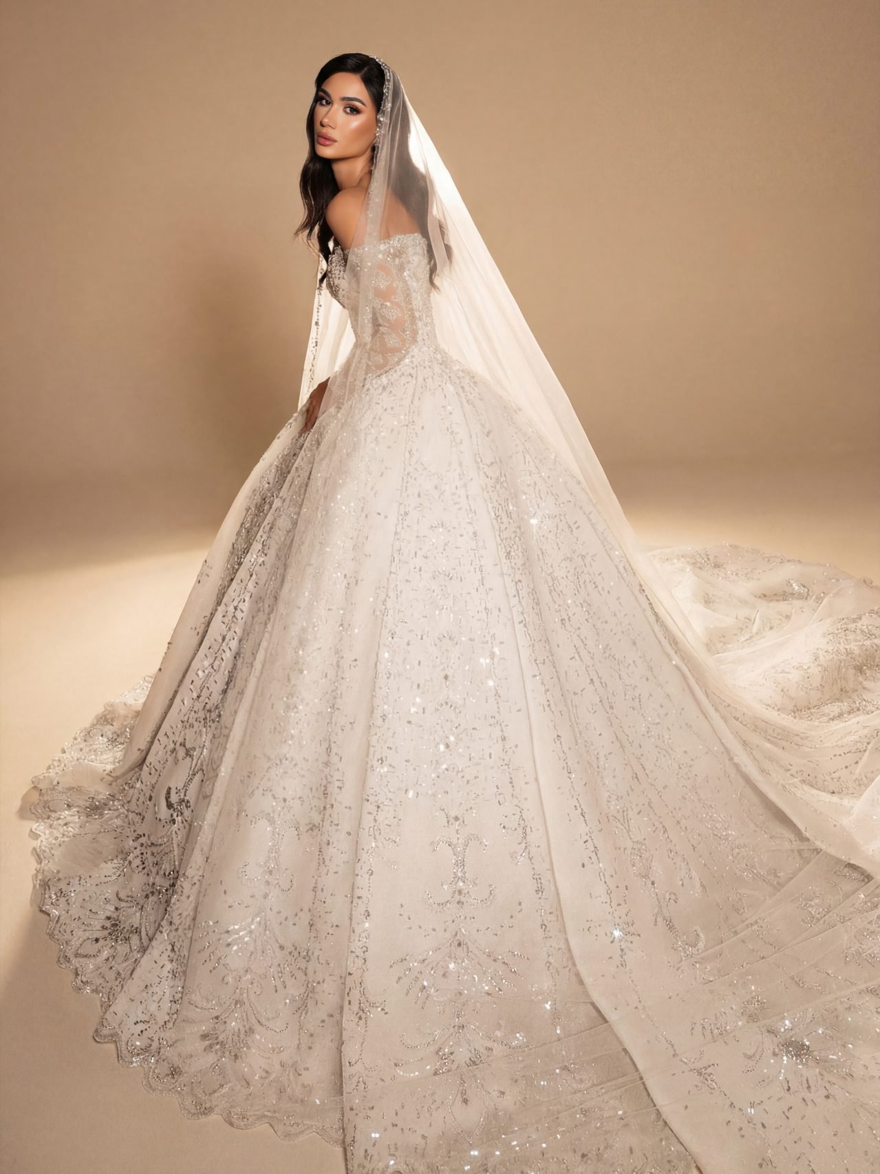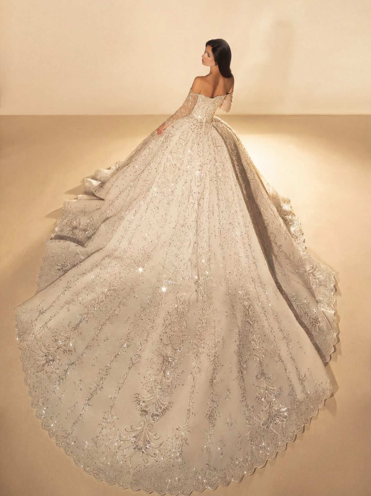 An off shoulder wedding gown with sweetheart neckline featuring a voluminous ball gown skirt, heavily encrusted with silver crystals and metallic beadworks in Baroque patterns that trail down to an elegant scalloped hemline